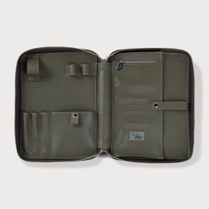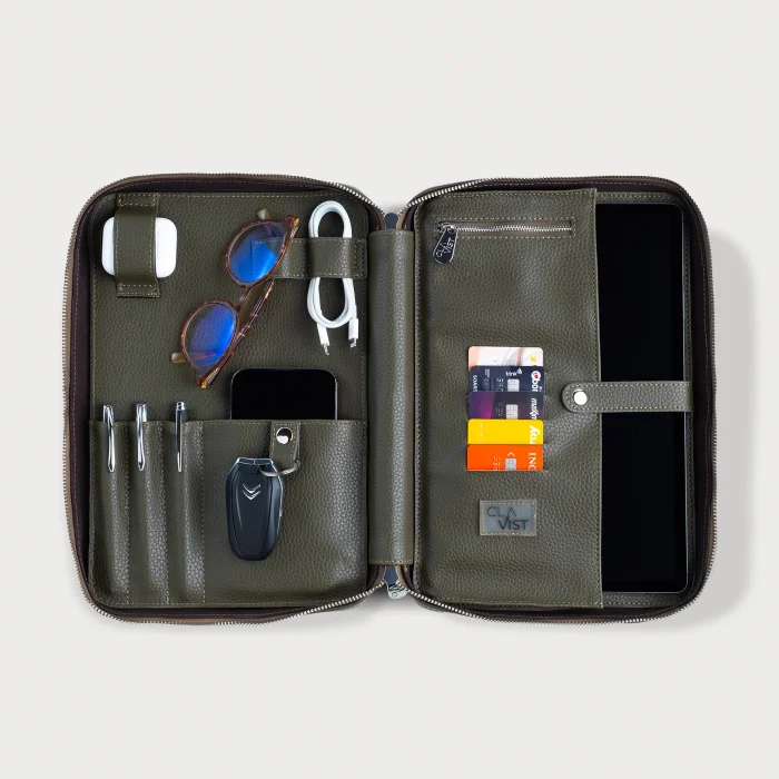 İç Yerleşim: Şarj cihazı bölmesi, çok amaçlı deri slotu, çıtçıtlı anahtarlık bölmesi, ajanda not defteri (25 cm x 15 cm), Airpods bölmesi, 3 adet kalemlik bölümü, 2 adet USB kablo bölümü