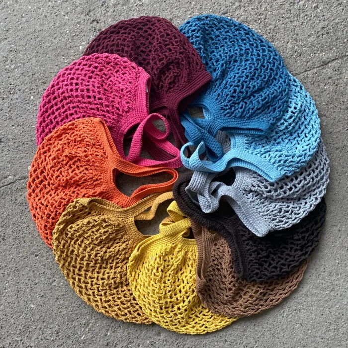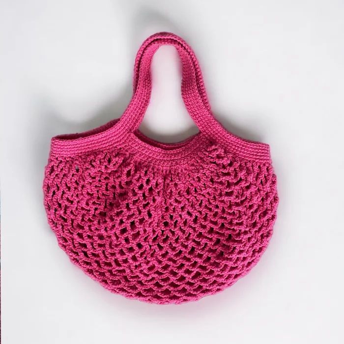 Sürdürülebilir malzeme ile üretilmiş el örgüsü file çanta.