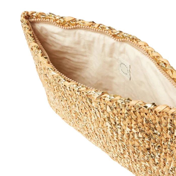 Püskül detaylı, simli rafya ip ile elde örülmüş clutch formunda çanta.