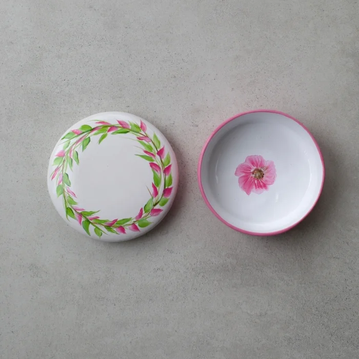 Estetiği ve zarafeti bir araya getiren seramik takı kutularımız, her biri tasarımcımız Derya Kurdoğlu'nun benzersiz el emeği çiçekleri ile süslenmiştir.