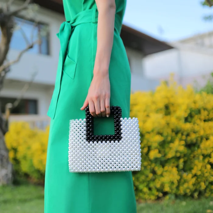 Formlu siyah beyaz boncuk çanta. Tutma saplı.