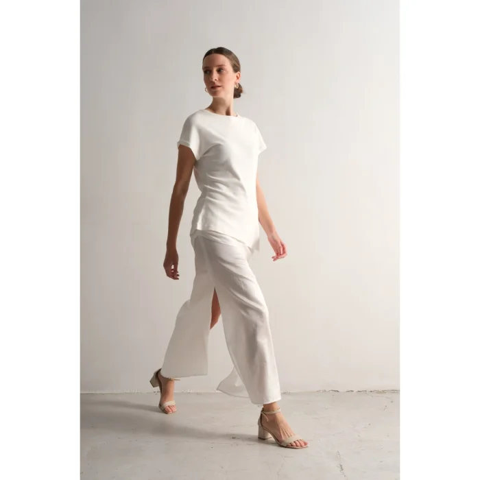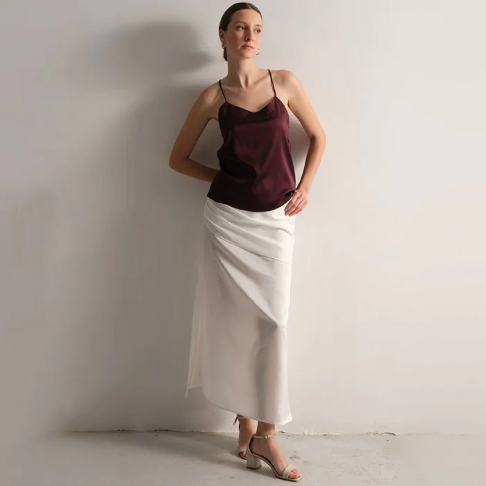 Çift katmanlı tasarımı sayesinde astarlı olup iç göstermeden şeffaf görünüm sunar.Üst parçası kumaşın tersi kullanılarak mat elde edilmiştir, eteğin alt kısmı ipek lifinin özelliğinden dolayı hafif parlaktır.