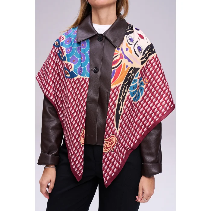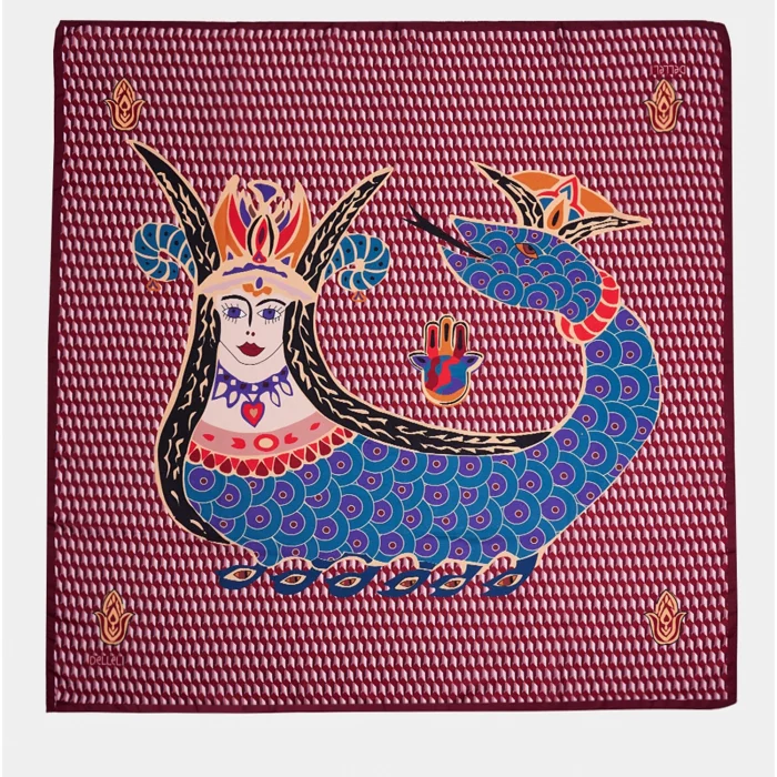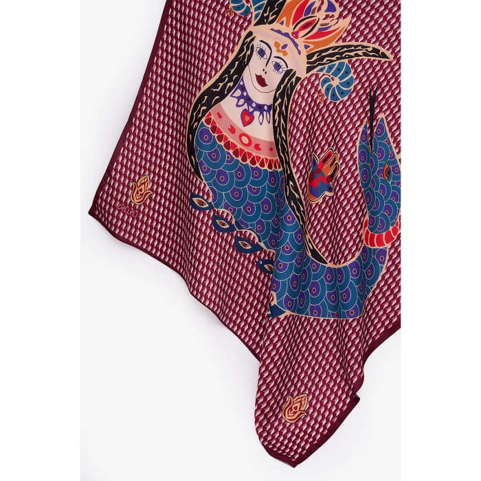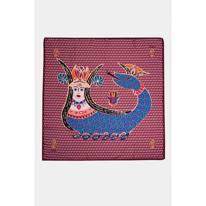 Canlı renkleri, detaylı işlenmiş Şahmeran figürü ve güçlü sembolik dokunuşlarıyla hem şık bir aksesuar hem de kültürel bir ifade aracı olarak öne çıkar. 110x110 cm ölçüsü sayesinde farklı bağlama stillerine uyum sağlar; ister boyunda ister çantada, ister saç aksesuarı olarak kullanıldığında tarzınıza sofistike bir dokunuş ekler.