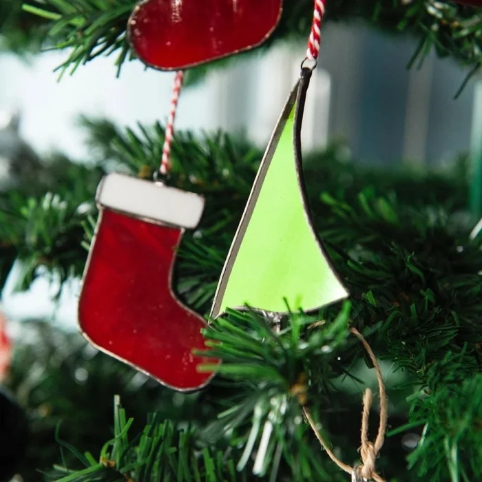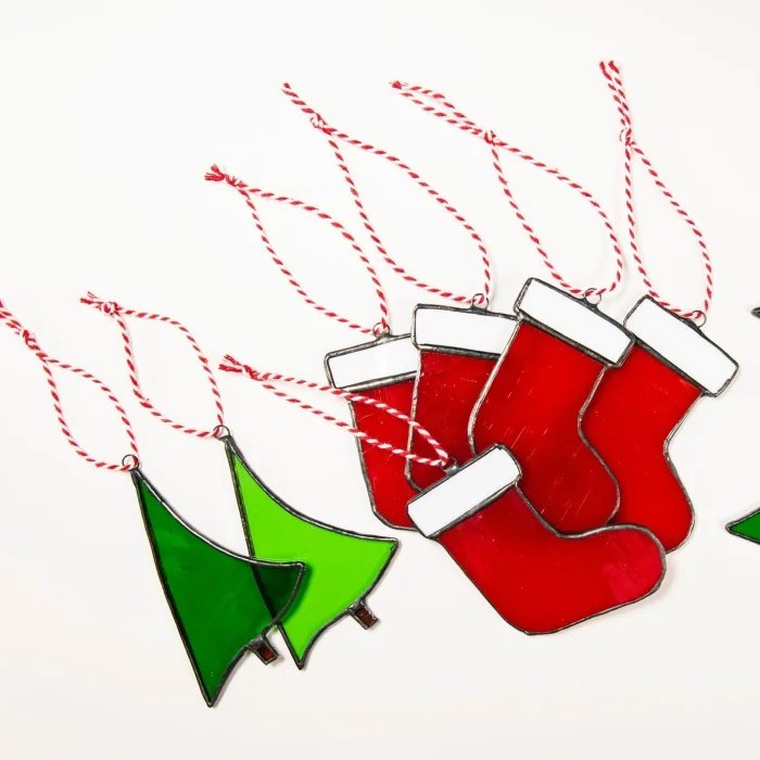 Kırmızı opak ve yeşil kathedral camdan kesilmiş olan ürünler, 3 kırmızı çorap, 3 çam ağacı olarak paketlenmiştir.
