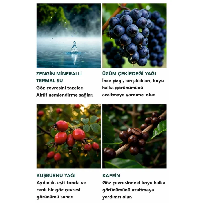 Öne Çıkan İçerikler: Termal Su; Kuşburnu Çekirdeği Yağı, İncir Çekirdeği Yağı, Avokado Yağı, Ölmez Çiçek Ekstraktı, Üzüm Çekirdeği Yağı, Shea Butter, Aronya Ekstraktı, Söğüt Ekstraktı, Centella Ekstraktı, Papatya Ekstraktı, Aynısefa Ekstraktı, Akgünlük Uçucu Yağı, Neroli Uçucu Yağı, Vetiver Uçucu Yağı, Gül Suyu, Jojoba Yağı, E Vitamini, Hyaluronic Acid, Kafein, Niasinamid (B3 Vitamini), Çinko Oksit