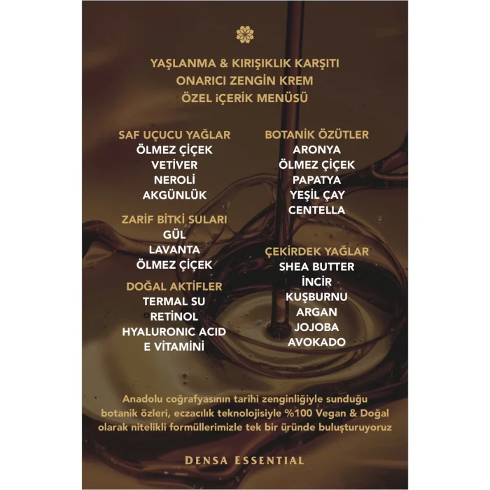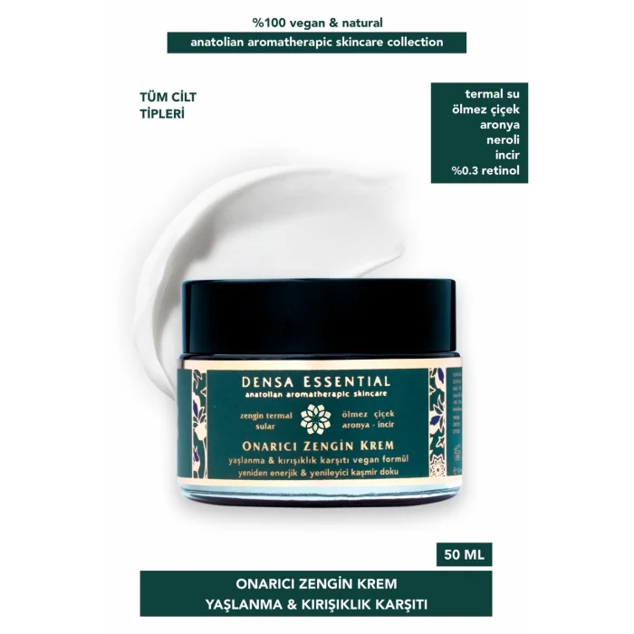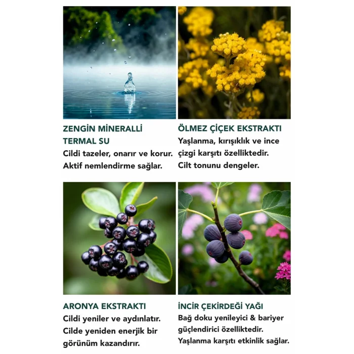 Öne Çıkan İçerikler: Termal Su, Retinol, Ölmez Çiçek Esktraktı, İncir Çekirdeği Yağı, Kuşburnu Çekirdeği Yağı, Argan Yağı, Jojoba Yağı, Avokado Yağı, Aronya Ekstraktı, Papatya Ekstraktı, Ölmez Çiçek Suyu, Centella Ekstraktı, Neroli Uçucu Yağı, Akgünlük Uçucu Yağı, Vetiver Uçucu Yağı, Yeşil Çay Ekstraktı, Shea Butter, Gül Suyu, Lavanta Suyu, Hyaluronic Acid