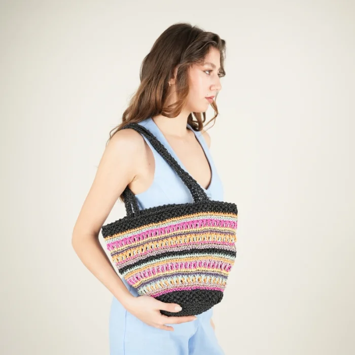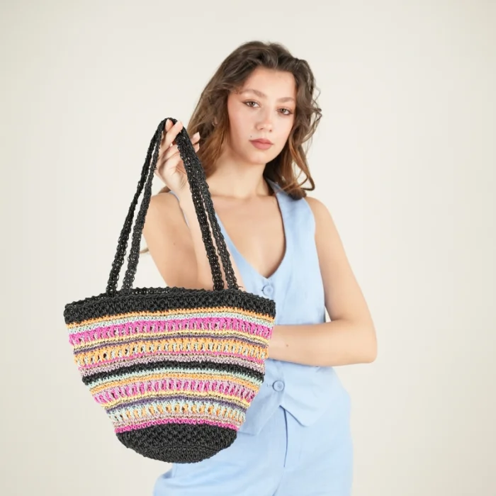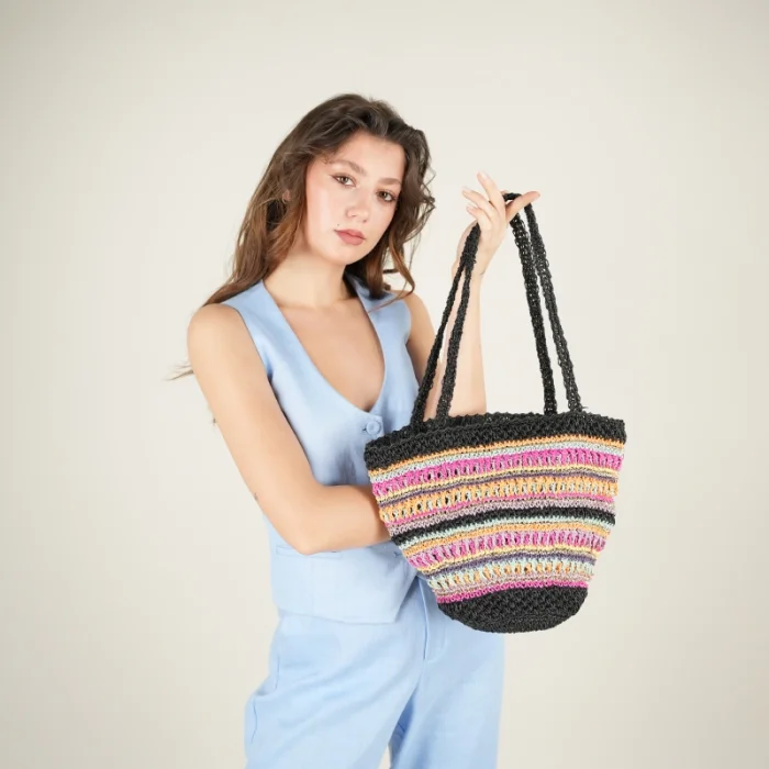 Bu El Örgüsü Rafya Kadın Omuz ve El Çantası, bohem tarzı ve doğal dokuları bir araya getiren özel bir tasarımdır. Siyah ağırlıklı renk uyumu, özenle işlenmiş renkli motif detaylarıyla hareketlendirilerek göz alıcı bir görünüm sunar.