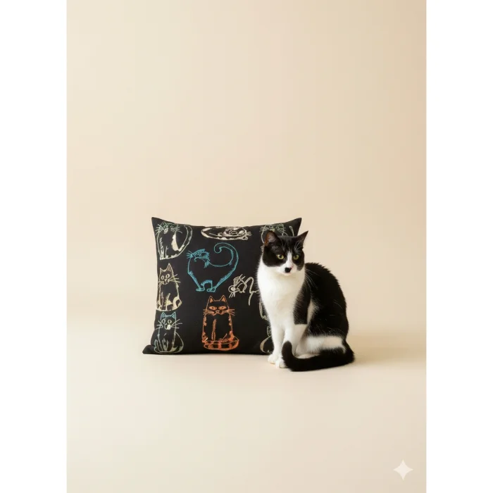 Bu sadece bir yastık kılıfı değil; kedilerin kendine has dünyasını yansıtan küçük bir sanat galerisi! El Yapımı Nakışlı Kedi Yastık Kılıfımız, her biri canlı ve renkli iplerle hayat bulmuş, eskiz tarzında tasarlanmış eşsiz kedi illüstrasyonlarından oluşuyor. Zanaatkar işçiliğine ve bohem tarza değer veren kedi tutkunları için mükemmel bir seçim.