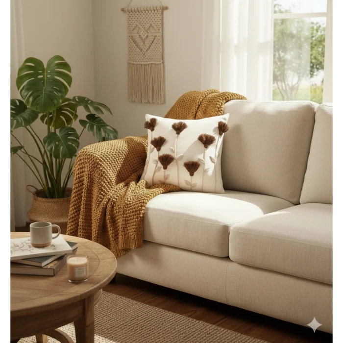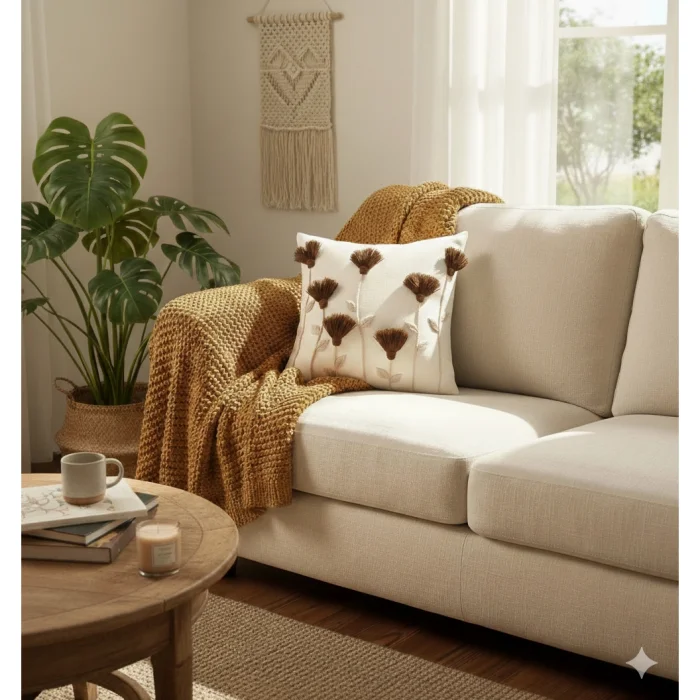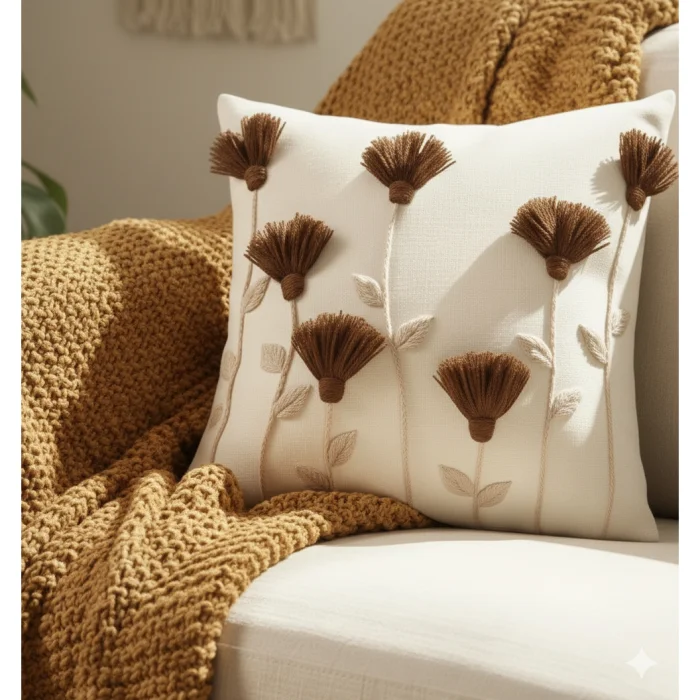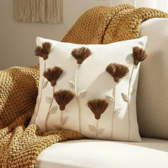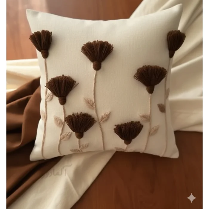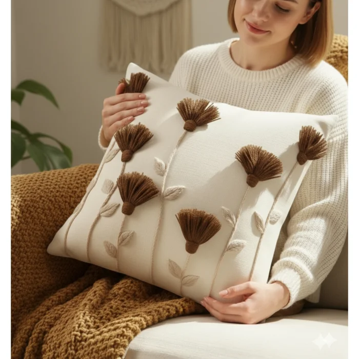 Bu el yapımı krem yastık kılıfı, püskül detayları ve rustik kahverengi çiçek punch iğne işlemeleri ile evinize sıcak ve şık bir dokunuş katıyor. Arka kısmındaki gizli fermuar sayesinde kılıfı kolayca çıkarıp temizleyebilirsiniz. Yaklaşık 45 cm boyutundadır ve oturma odası, yatak odası veya okuma köşeniz için idealdir. Kır evi, bohem veya rustik dekorasyon tarzları için uygundur ve yeni ev veya ev hediyesi olarak düşünceli bir seçimdir.