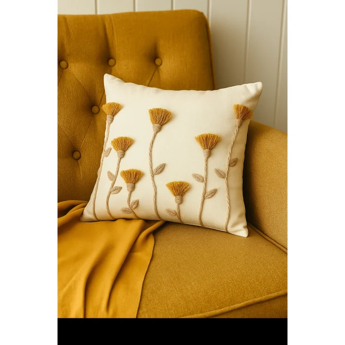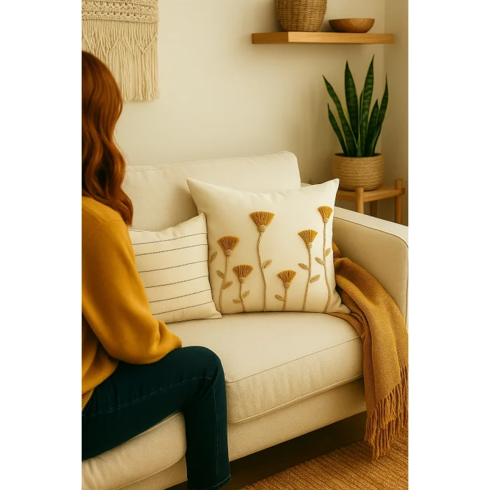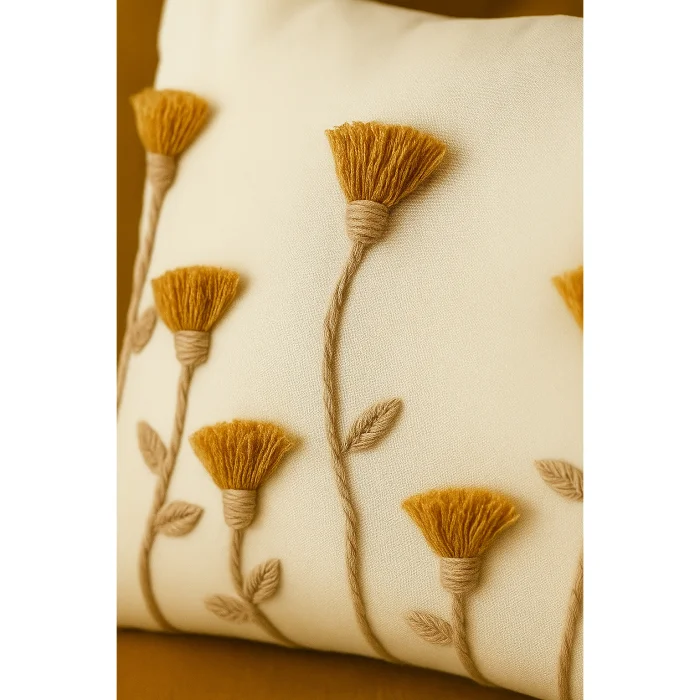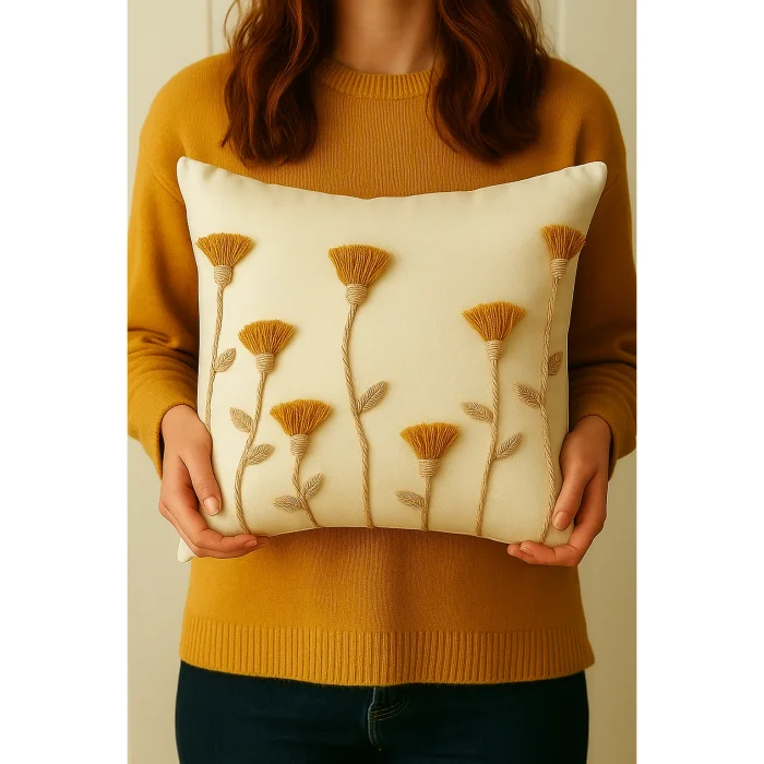 Bu el yapımı krem yastık kılıfı, püskül detayları ve rustik kahverengi çiçek punch iğne işlemeleri ile evinize sıcak ve şık bir dokunuş katıyor. Arka kısmındaki gizli fermuar sayesinde kılıfı kolayca çıkarıp temizleyebilirsiniz. Yaklaşık 45 cm boyutundadır ve oturma odası, yatak odası veya okuma köşeniz için idealdir. Kır evi, bohem veya rustik dekorasyon tarzları için uygundur ve yeni ev veya ev hediyesi olarak düşünceli bir seçimdir.