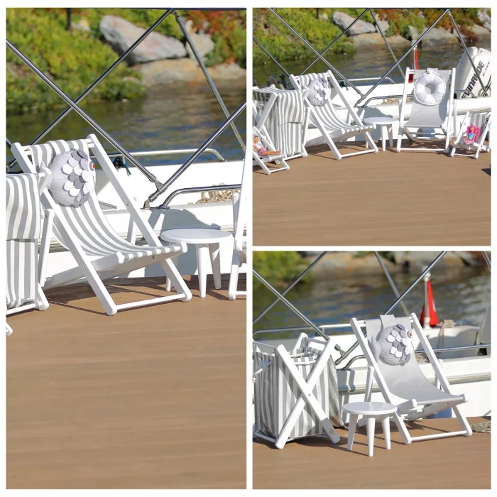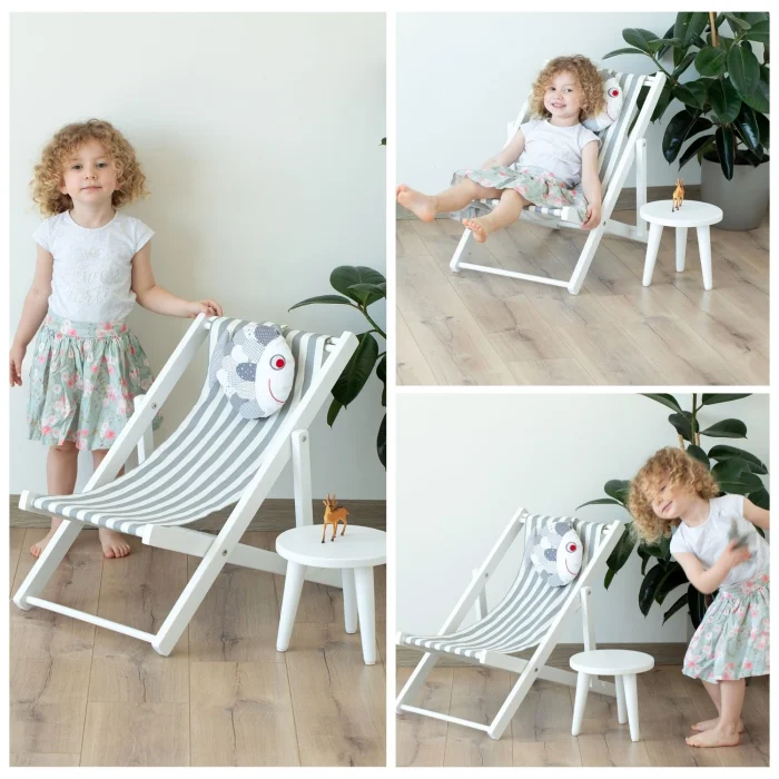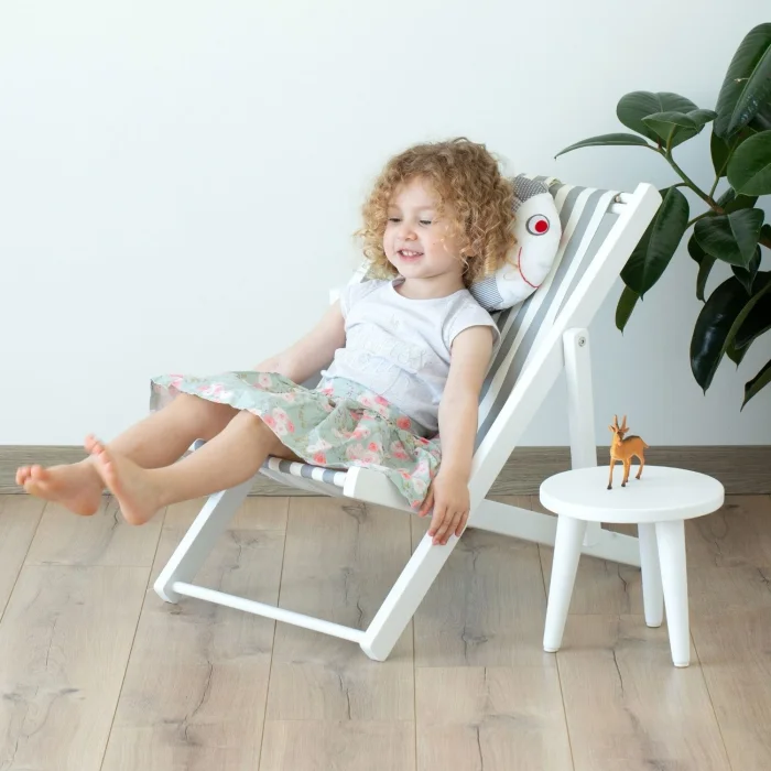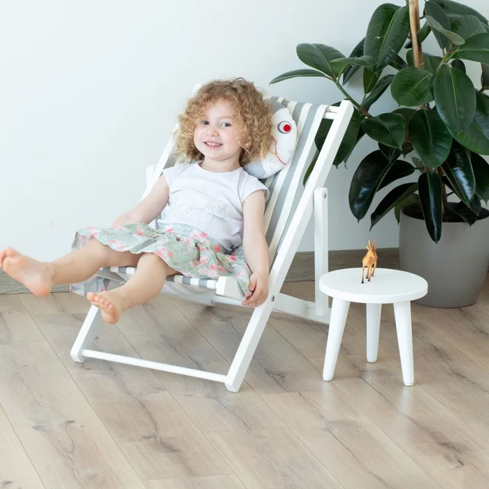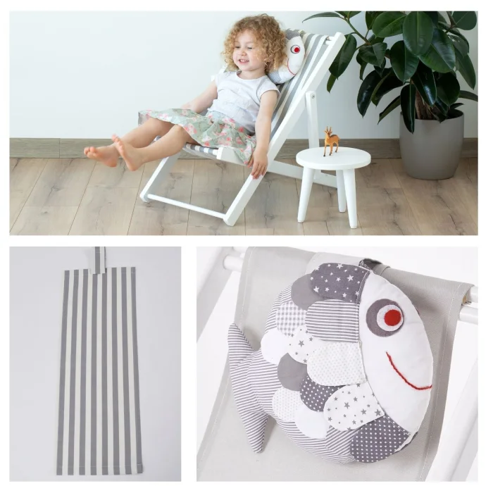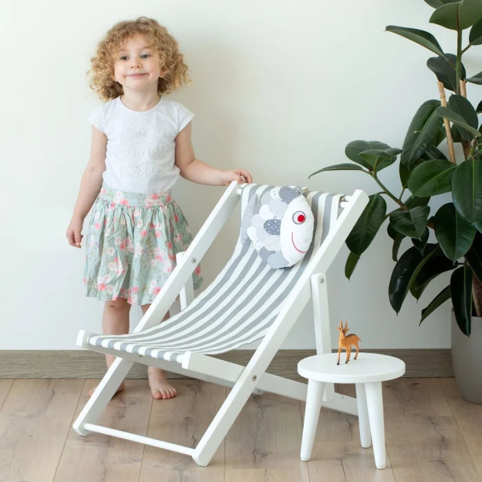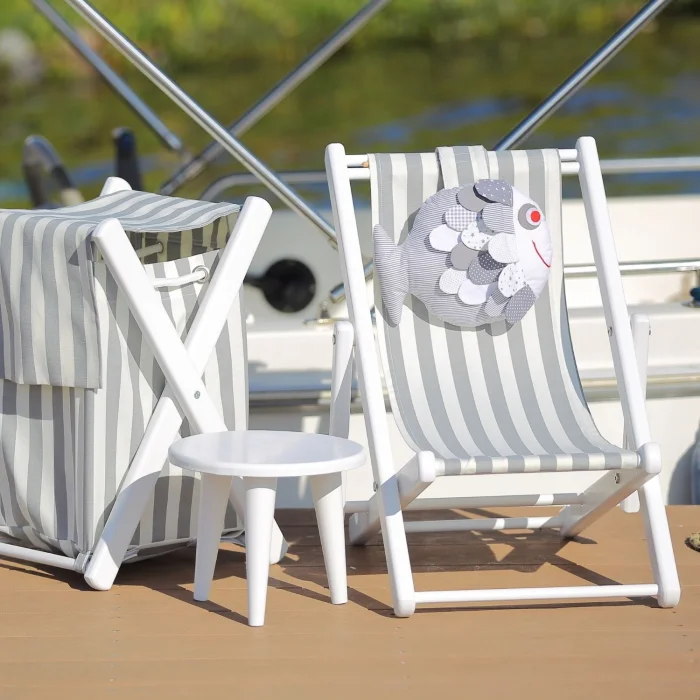 - İki kademeli su bazlı beyaz boyalı masif ahşap eğlenceli çocuk dinlenme koltuğu. Balık yastık ve gri-beyaz çizgili minder dahildir.