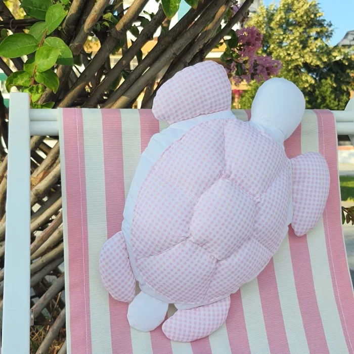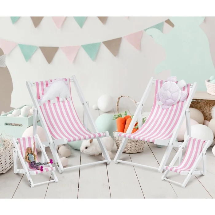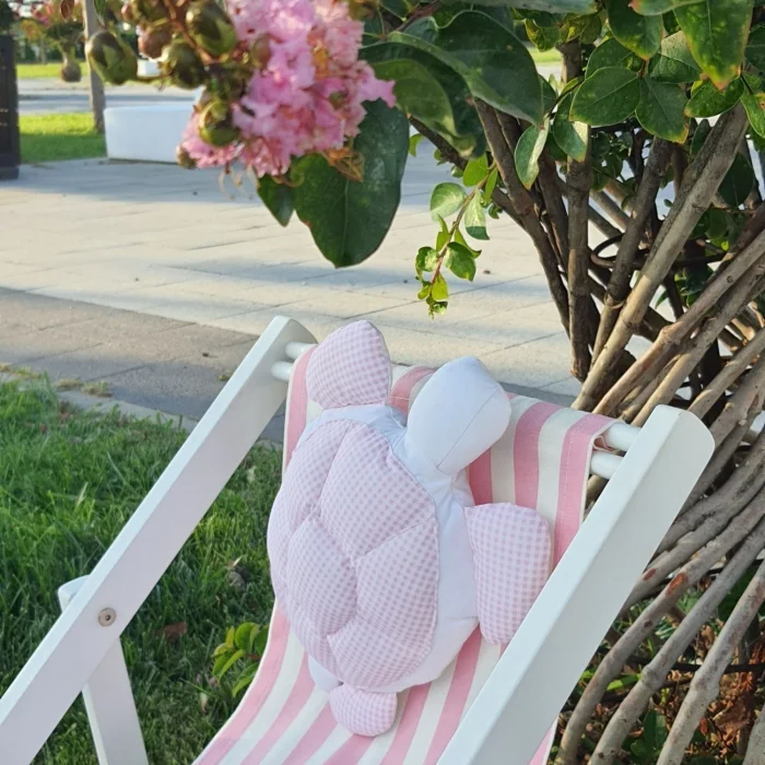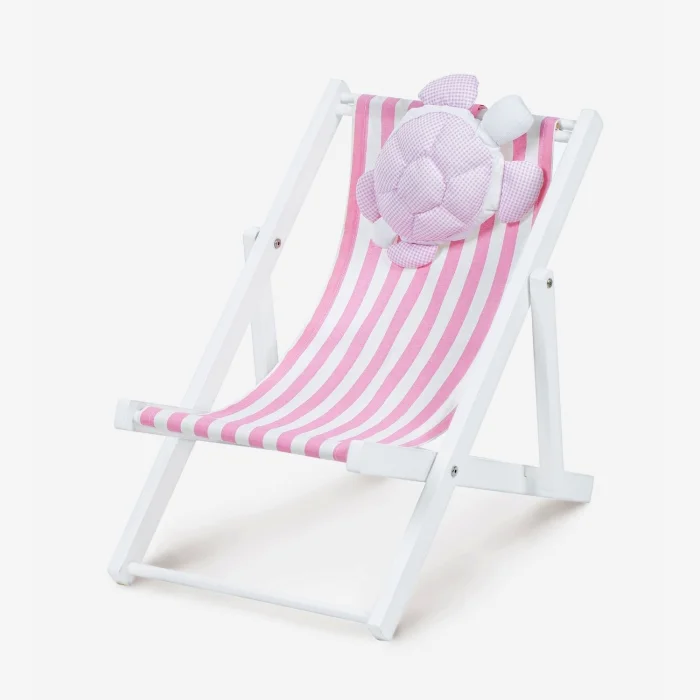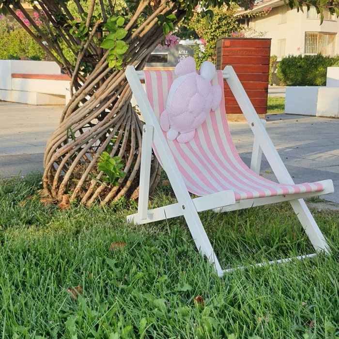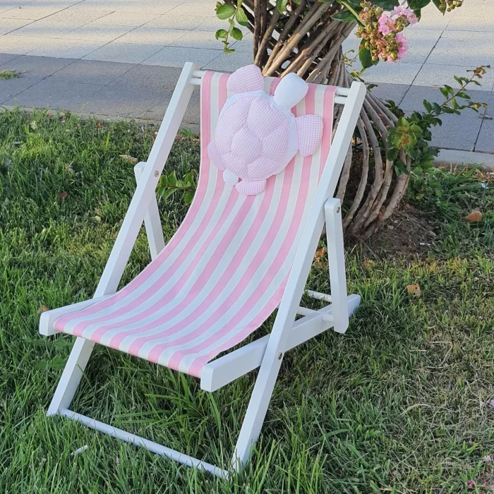 İki kademeli masif ahşap eğlenceli çocuk dinlenme koltuğu. Şampiyon Caretta Caretta yastık ve pembe-beyaz çizgili minder dahildir.