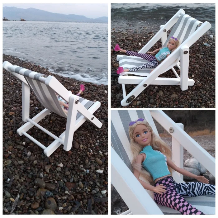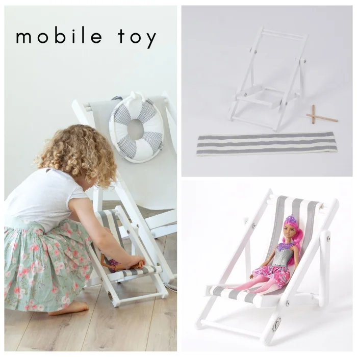 - Su bazlı beyaz boyalı masif ahşap oyuncak bebek koltuğu. Gri-beyaz çizgili minder dahil.