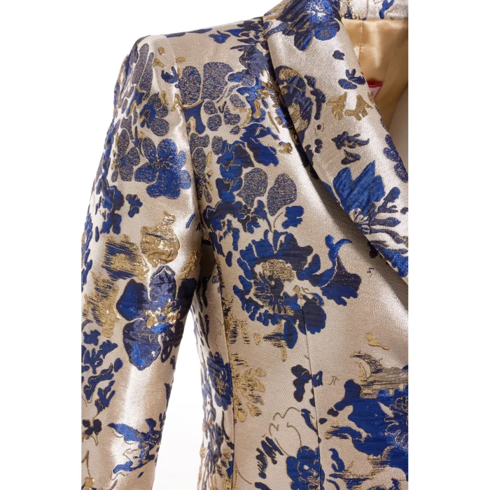 Jakarlı ve simli brokar dokuma kumaş, klasik kesim ceket.