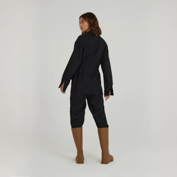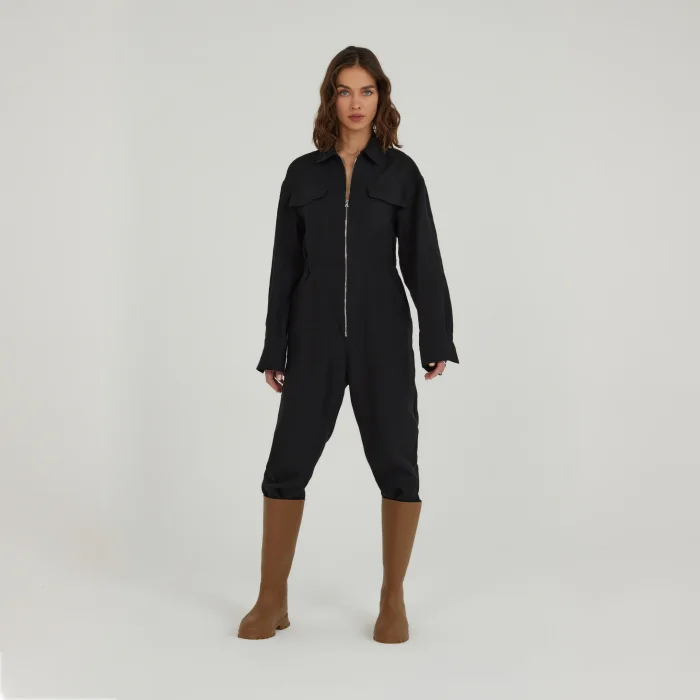 Fermuarlı, beli lastikli, uzun kollu bol keten tulum