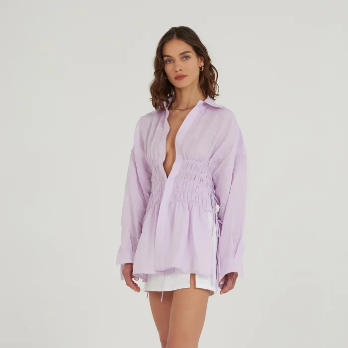 Beli büzgülü, yanlarda ve önde bağcıklı, yarasa kol keten gömlek