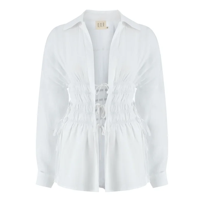 Beli büzgülü, yanlarda ve önde bağcıklı, yarasa kol keten gömlek