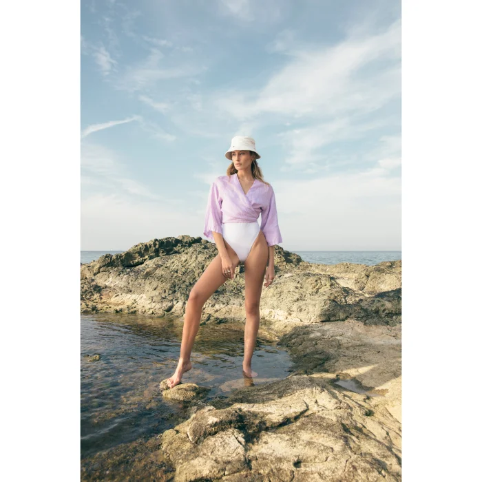 3/4 kol, önden ve arkadan bağlanabilen ince keten gömlek