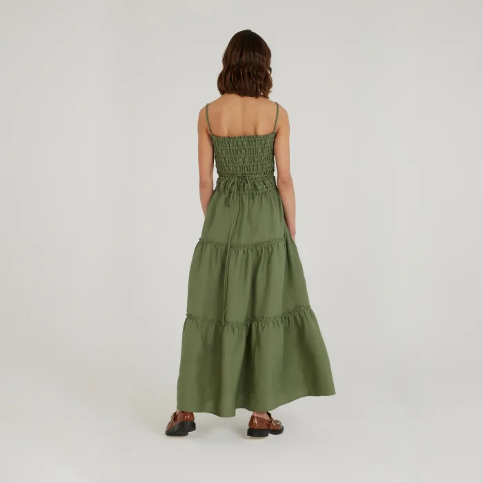 Beli ve göğsü büzgülü, askılı, uzun keten elbise