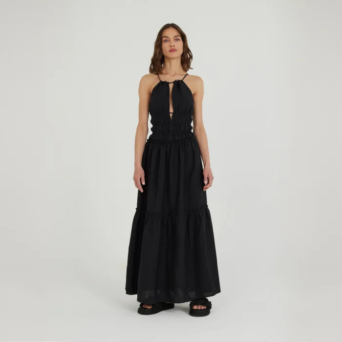 Beli büzgü detaylı, dekolteli, arkadan bağlamalı uzun keten elbise