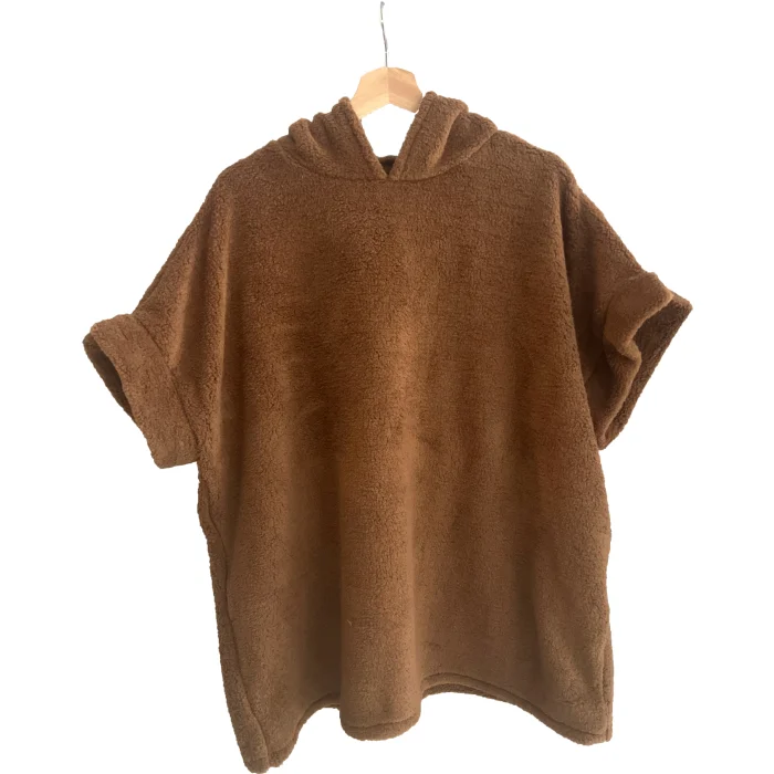 Kapüşonlu, Kısa Kollu, İçi ve Dışı Yumoş Kahverengi Peluş Sweatshirt