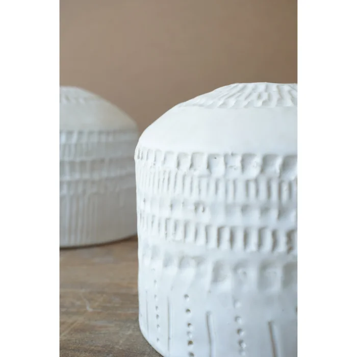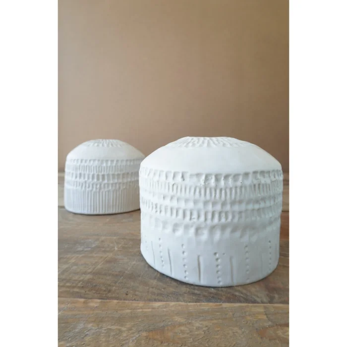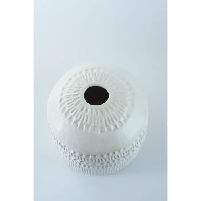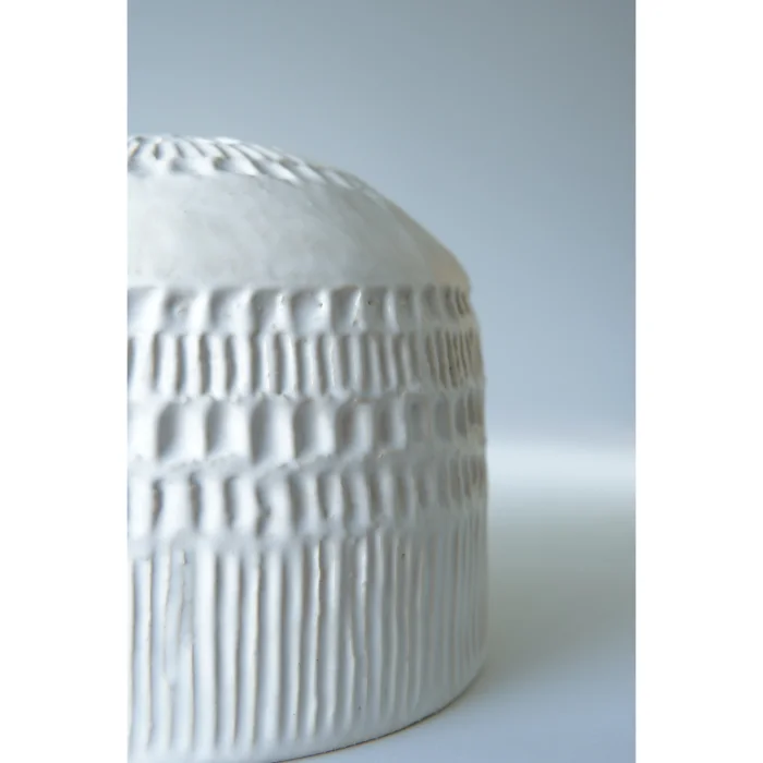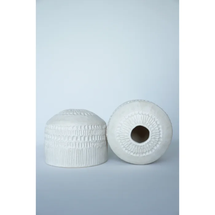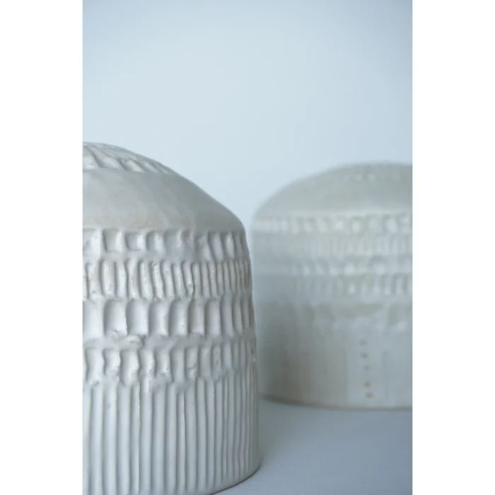 Yumuşak süt beyazı sırlaması ve sakin dokusuyla, minimal ve zarif bir ifade sunar.