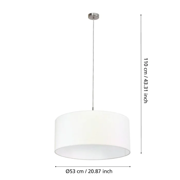 Ampul Duy Tipi: E27 Maksimum Watt: 1X60W Ürün Yüksekliği: 110 cm Ürün Çapı: 53 cm Net Ağırlık: 1.9 Kg Ana Materyal: Çelik Ana Renk: Nikel Mat Cam/Şapka Materyali: Tekstil Kumaş Cam/Şapka Rengi: Beyaz IP Durumu: IP20 Anahtar Tipi: Duvar Anahtarı Ürün Voltajı: 220-240V,50/60Hz