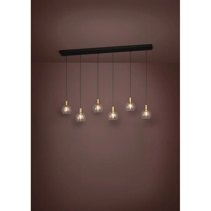 Ampul Duy Tipi: LED Maksimum Watt: 6X5.4W Ampul Dahildir. Ürün Yüksekliği: 150 cm Ürün Uzunluğu: 138 cm Ürün Genişliği 25 cm Net Ağırlık: 8.7 Kg Ana Materyal: Çelik Ana Renk: Siyah, Fırçalanmış Pirinç Cam/Şapka Materyali: Cam Cam/Şapka Rengi: Şeffaf Kelvın: 3000K Lümen: 3060 IP Durumu: IP20 Anahtar Tipi: Duvar Anahtarı Ürün Voltajı: 220-240V,50/60Hz