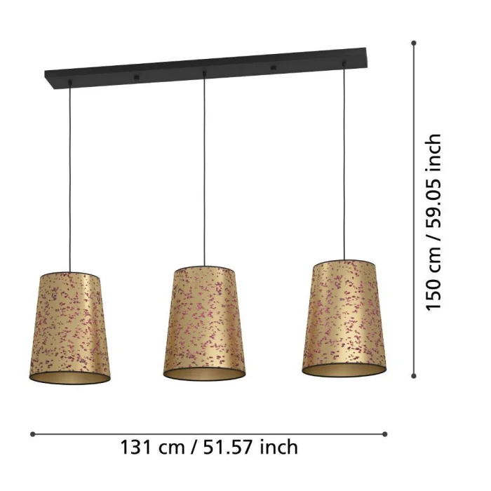 Ampul Duy Tipi: E27 Maksimum Watt: 3X25W Ürün Yüksekliği: 150 cm Ürün Uzunluğu: 131 cm Ürün Genişliği 30 cm Net Ağırlık: 5.18 Kg Ana Materyal: Çelik Ana Renk: Siyah Cam/Şapka Materyali: Gül Yapraklı Kağıt Cam/Şapka Rengi: Altın Rengi, Pembe IP Durumu: IP20 Anahtar Tipi: Duvar Anahtarı Ürün Voltajı: 220-240V,50/60Hz