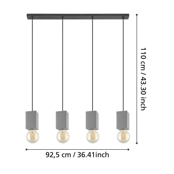 Ampul Duy Tipi: E27 Maksimum Watt: 4X40W Ürün Yüksekliği: 110 cm Ürün Uzunluğu: 92.5 cm Ürün Genişliği 5.5 cm Net Ağırlık: 5.37 Kg Ana Materyal: Çelik Ana Renk: Siyah Cam/Şapka Materyali: Beton Cam/Şapka Rengi: Gri IP Durumu: IP20 Anahtar Tipi: Duvar Anahtarı Ürün Voltajı: 220-240V,50/60Hz