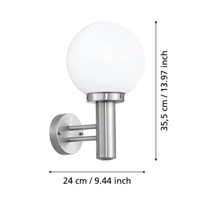 Ampul Duy Tipi:E27 Maksimum Watt: 1X60W Ürün Yüksekliği: 36 cm Ürün Uzunluğu: 20 cm Provizyon Çıkıntısı: 24 cm Net Ağırlık: 1.39 Kg Ana Materyal: Paslanmaz Çelik Ana Renk: Paslanmaz Çelik Cam/Şapka Materyali: Buzlu Cam Cam/Şapka Rengi: Beyaz IP Durumu: IP44 Fonksiyonlar: Köşe Bağlantısı Anahtar Tipi: Duvar Anahtarı Ürün Voltajı: 220-240V,50/60Hz