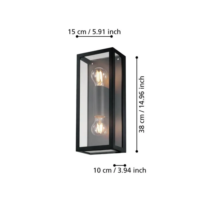 Ampul Duy Tipi:E27 Maksimum Watt: 2X60W Ürün Yüksekliği: 38 cm Ürün Uzunluğu: 15 cm Provizyon Çıkıntısı: 10 cm Net Ağırlık: 2.23 Kg Ana Materyal: Çelik Ana Renk: Siyah Cam/Şapka Materyali: Cam Cam/Şapka Rengi: Şeffaf IP Durumu: IP44 Anahtar Tipi: Duvar Anahtarı Ürün Voltajı: 220-240V,50/60Hz