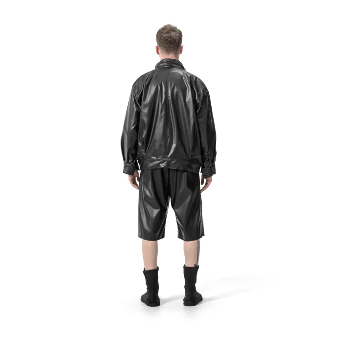 Rahat kesimli, dik yakalı, astarlı, ön detayı elyafla desteklenmiş, dikiş ile aslan yüzü nakışı eklenmiş eko deri ceket. Fermuar ve çıtçıtla açılır