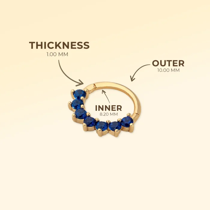 14 ayar Altın Safir (Yuvarlak Kesim): 7 parça Dış Çap: 10.00 mm / İç Çap: 8,20 mm Ağırlık: 0,51 gr. *Piercingler tekli olarak satılmaktadır.