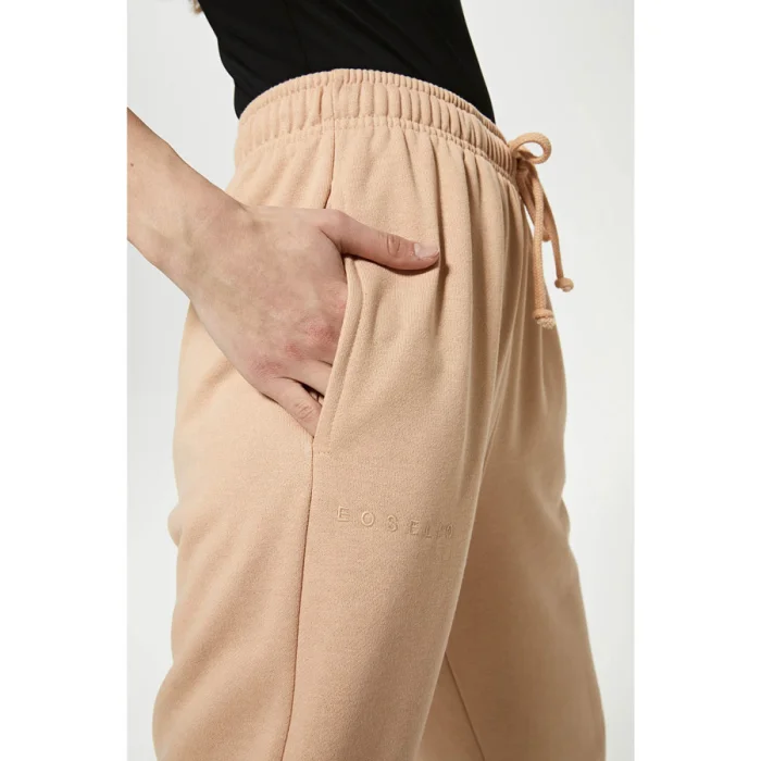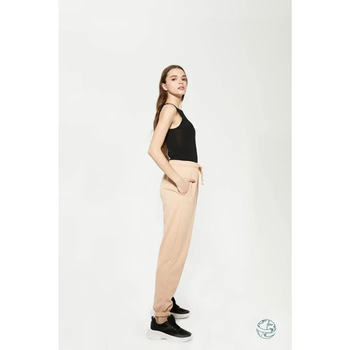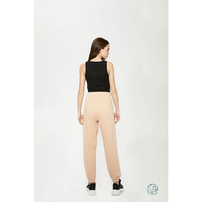 Yüksek belli, beli ve paçası lastikli jogger. Nakış detaylı. Cepli. Pamuklu kordon.
