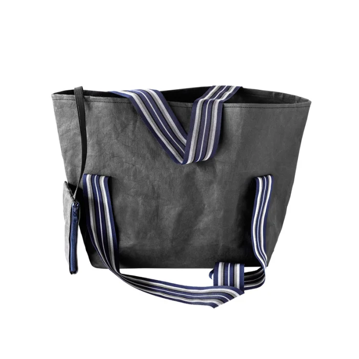 Renkli kurdeleyle tamamlanmış plaj çantası. Geridönüşümlü yıkanabilir kağıtlar. Suya ve yırtılmaya dayanıklı.