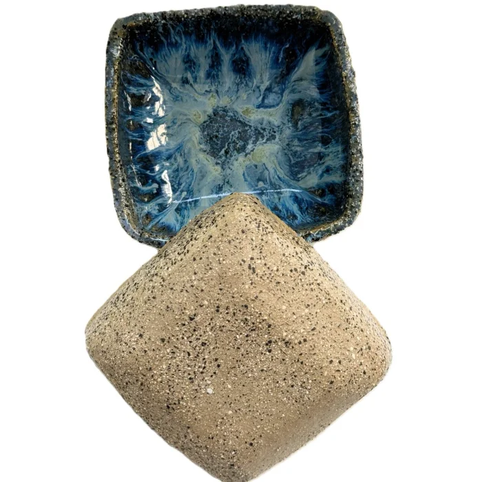 İkili set olarak satılmaktadır. Doğal malzemelerden üretilen bu stoneware çanak, benzersiz dokusu ve estetik tasarımıyla sofralarınıza şıklık katıyor. Dış yüzeyindeki pütürlü ve doğal taş efektli dokusu, el işçiliğinin zarif detaylarını yansıtırken, iç kısmındaki özel sır ile mavi ve beyaz tonlarıyla göz alıcı bir kontrast oluşturuyor.