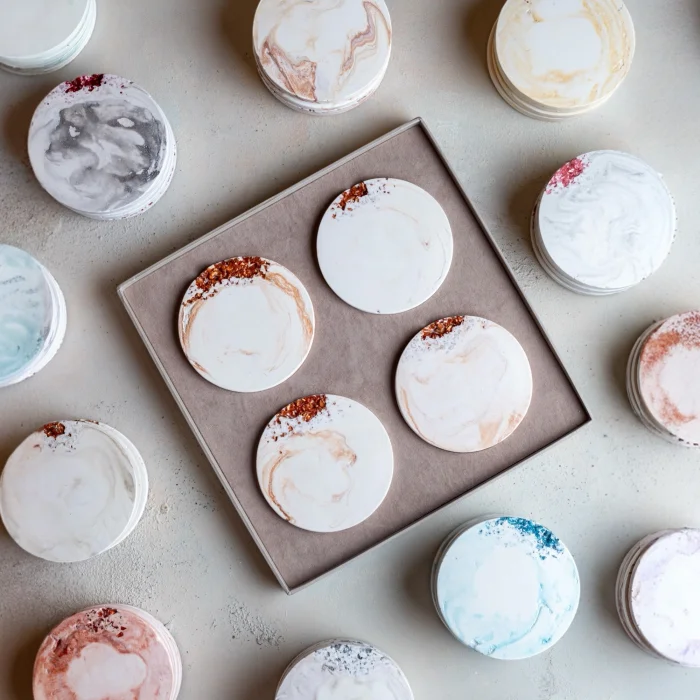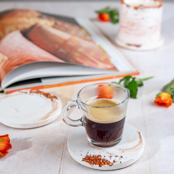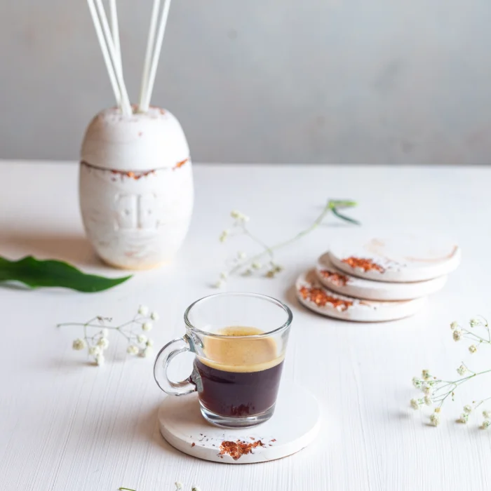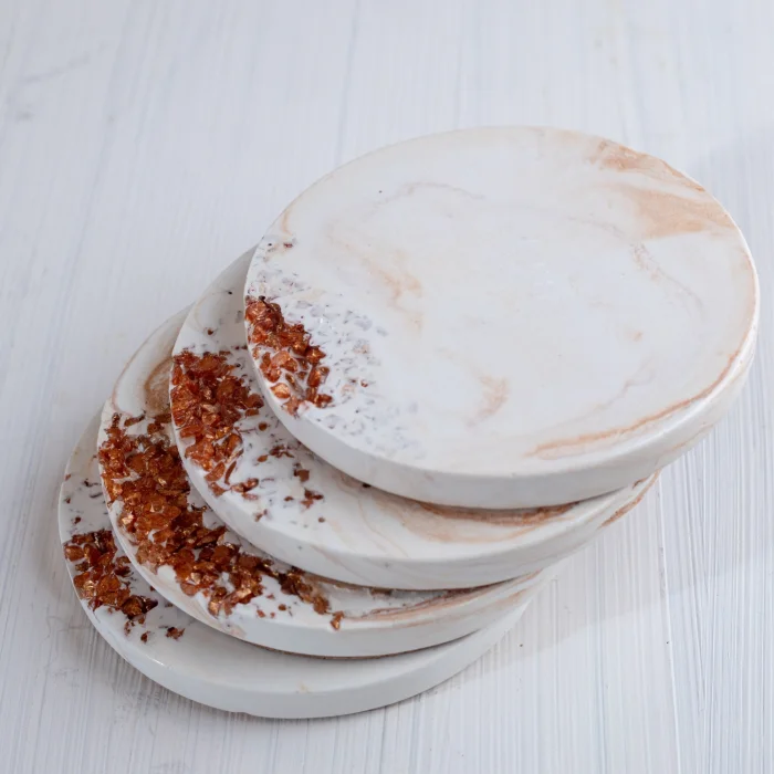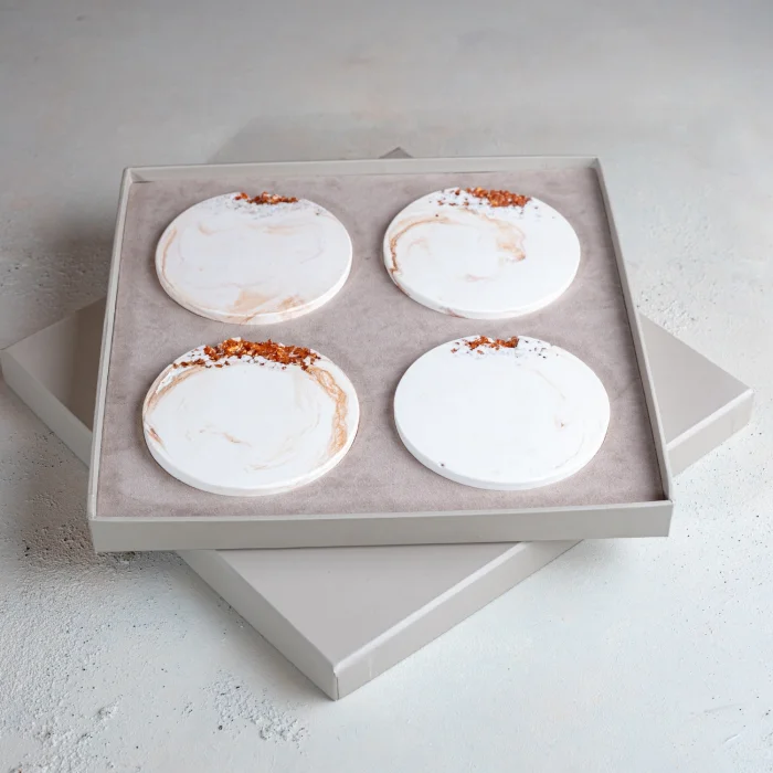 El yapımı taş tozundan üretilmiş, kristal cam detaylarıyla öne çıkan 4’lü bardak altlığı seti, şık paketlemesiyle birlikte sunulmaktadır.
