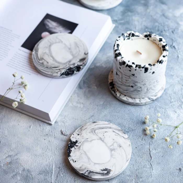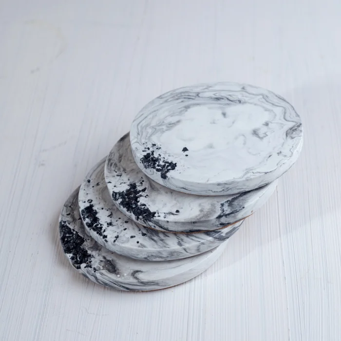 El yapımı taş tozundan üretilmiş, kristal cam detaylarıyla öne çıkan 4’lü bardak altlığı seti, şık paketlemesiyle birlikte sunulmaktadır.