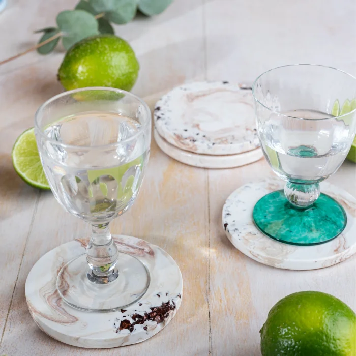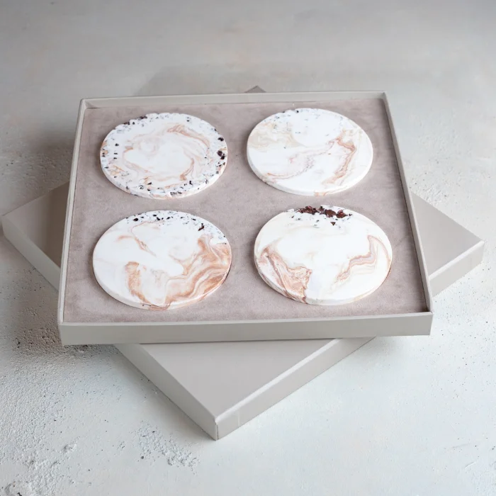 El yapımı taş tozundan üretilmiş, kristal cam detaylarıyla öne çıkan 4’lü bardak altlığı seti, şık paketlemesiyle birlikte sunulmaktadır.