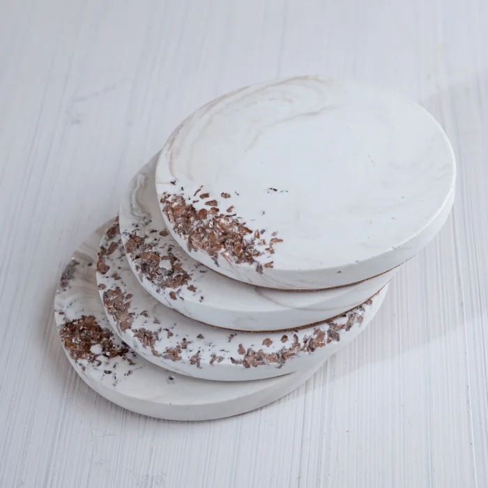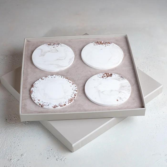 El yapımı taş tozundan üretilmiş, kristal cam detaylarıyla öne çıkan 4’lü bardak altlığı seti, şık paketlemesiyle birlikte sunulmaktadır.