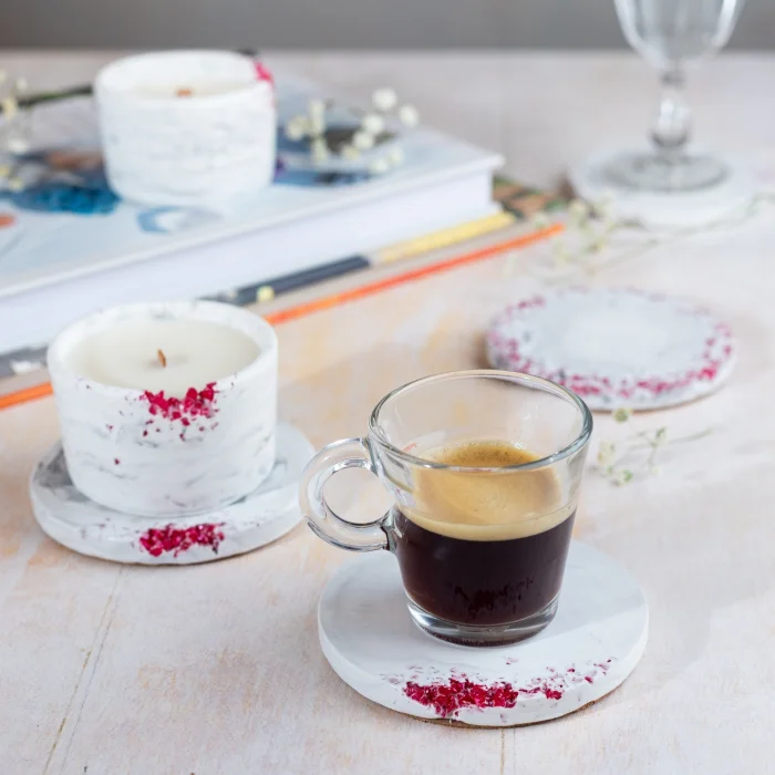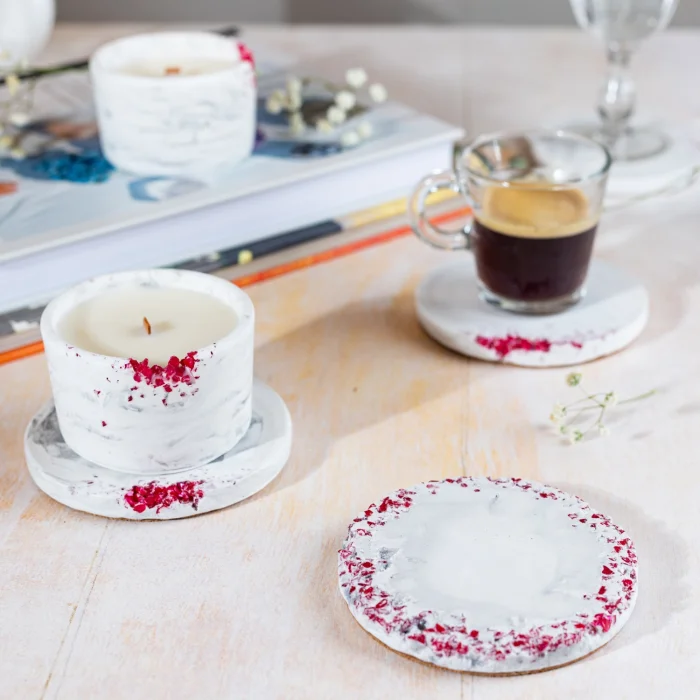 El yapımı taş tozundan üretilmiş, kristal cam detaylarıyla öne çıkan 4’lü bardak altlığı seti, şık paketlemesiyle birlikte sunulmaktadır.