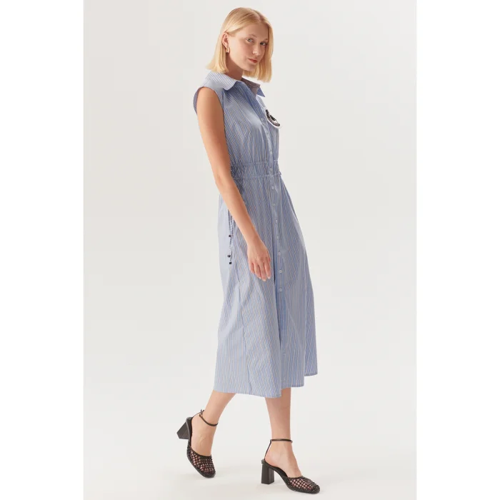 Doğal dokusu ve zamansız tasarımıyla öne çıkan pamuklu, beli lastikli bağcık detaylı mavi çizgili midi gömlek elbise, gün boyu konforu ve şıklığı bir arada sunuyor. Hafif ve nefes alabilen pamuklu kumaşı, sıcak günler için ideal bir kullanım sağlarken, klasik gömlek yaka detayı sofistike bir görünüm sunuyor.Bel kısmındaki ayarlanabilir bağcık detayı, vücuda uyum sağlayarak zarif bir siluet oluşturuyor. Kolsuz kesimi, elbiseye dinamik ve modern bir hava katarken, düğmeli ön tasarım çok yönlü bir kullanım imkanı sunuyor.Günlük stilinizde sandaletlerle rahat bir kombin oluşturabilir, akşamları topuklu ayakkabı ve zarif takılarla tamamlayarak şık bir görünüm elde edebilirsiniz. Hem şehirde hem de tatil rotalarında rahatlıkla tercih edilebilecek bu elbise, Exquise kadınının doğal ve zahmetsiz şıklığını yansıtıyor.