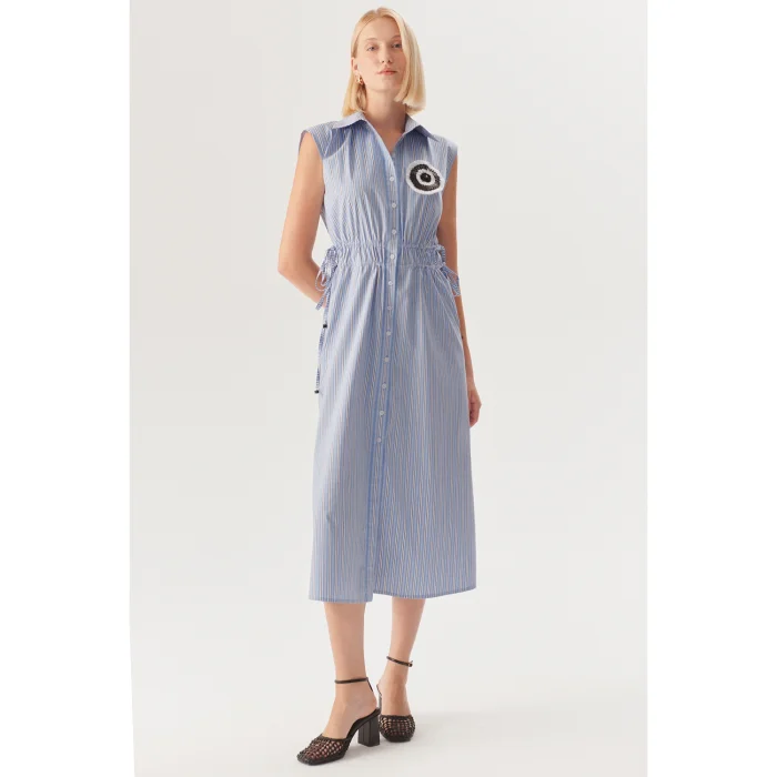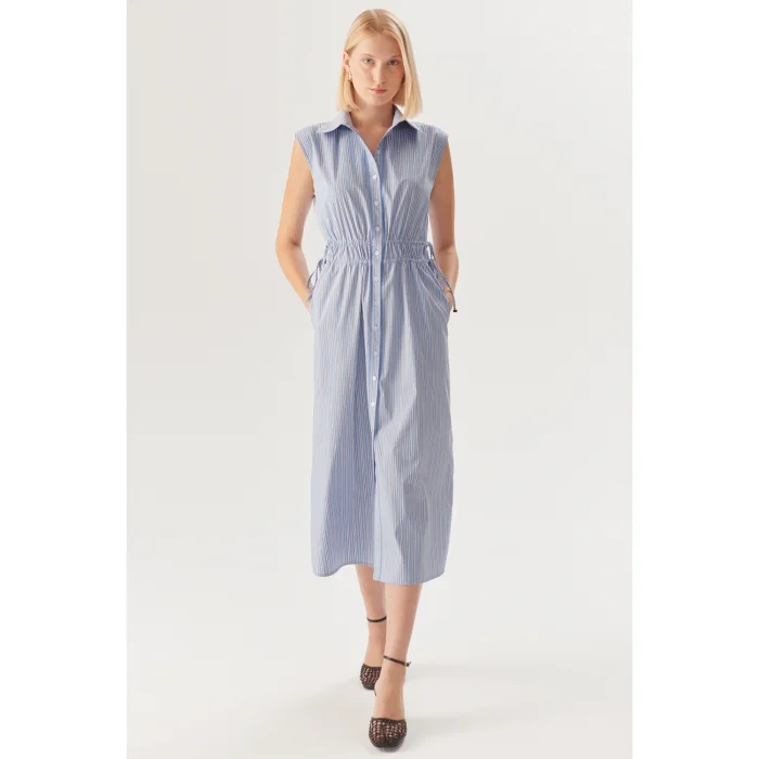 Doğal dokusu ve zamansız tasarımıyla öne çıkan pamuklu, beli lastikli bağcık detaylı mavi çizgili midi gömlek elbise, gün boyu konforu ve şıklığı bir arada sunuyor. Hafif ve nefes alabilen pamuklu kumaşı, sıcak günler için ideal bir kullanım sağlarken, klasik gömlek yaka detayı sofistike bir görünüm sunuyor.Bel kısmındaki ayarlanabilir bağcık detayı, vücuda uyum sağlayarak zarif bir siluet oluşturuyor. Kolsuz kesimi, elbiseye dinamik ve modern bir hava katarken, düğmeli ön tasarım çok yönlü bir kullanım imkanı sunuyor.Günlük stilinizde sandaletlerle rahat bir kombin oluşturabilir, akşamları topuklu ayakkabı ve zarif takılarla tamamlayarak şık bir görünüm elde edebilirsiniz. Hem şehirde hem de tatil rotalarında rahatlıkla tercih edilebilecek bu elbise, Exquise kadınının doğal ve zahmetsiz şıklığını yansıtıyor.