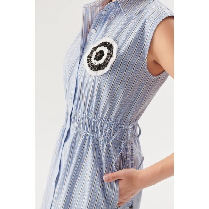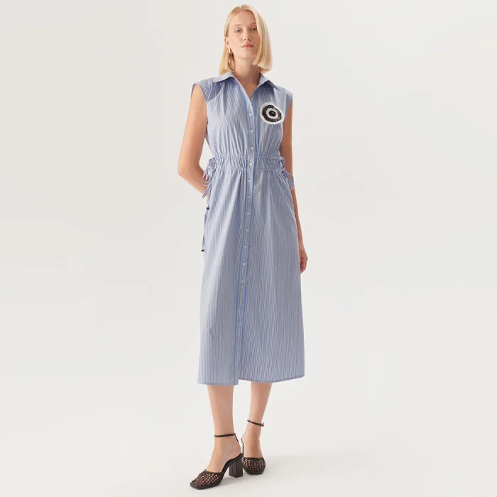 Doğal dokusu ve zamansız tasarımıyla öne çıkan pamuklu, beli lastikli bağcık detaylı mavi çizgili midi gömlek elbise, gün boyu konforu ve şıklığı bir arada sunuyor. Hafif ve nefes alabilen pamuklu kumaşı, sıcak günler için ideal bir kullanım sağlarken, klasik gömlek yaka detayı sofistike bir görünüm sunuyor.Bel kısmındaki ayarlanabilir bağcık detayı, vücuda uyum sağlayarak zarif bir siluet oluşturuyor. Kolsuz kesimi, elbiseye dinamik ve modern bir hava katarken, düğmeli ön tasarım çok yönlü bir kullanım imkanı sunuyor.Günlük stilinizde sandaletlerle rahat bir kombin oluşturabilir, akşamları topuklu ayakkabı ve zarif takılarla tamamlayarak şık bir görünüm elde edebilirsiniz. Hem şehirde hem de tatil rotalarında rahatlıkla tercih edilebilecek bu elbise, Exquise kadınının doğal ve zahmetsiz şıklığını yansıtıyor.