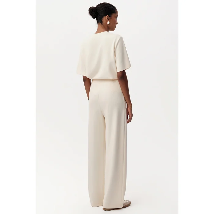 Rahat kesimli ve akıcı formda tasarlanan pantolon, geniş paça siluetiyle modern bir duruş sunar. Yüksek bel yapısı sayesinde vücuda uyum sağlar ve konforlu bir kullanım sunar. Esnek, dökümlü kumaşıyla günlük ve şehirli şıklığa uygun bir alternatiftir.
