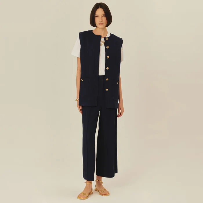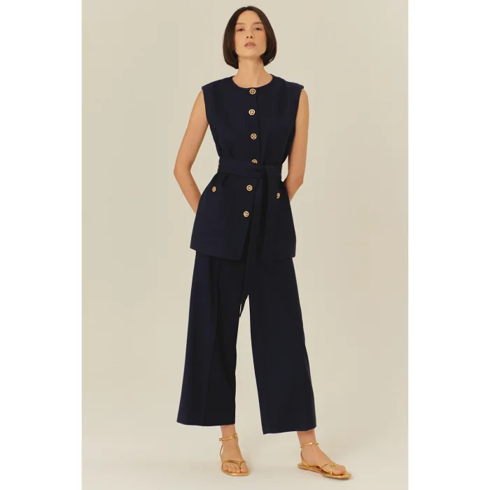 Zamansız şıklığa vurgu yapan bu lacivert yelek, dokulu kumaşı ve gold düğme detaylarıyla göz alıcı bir stil sunuyor. Beldeki kuşak, slim fit kesime zarif bir hareket katarken, cepler ise işlevsellik ve şıklığı aynı anda karşılıyor.