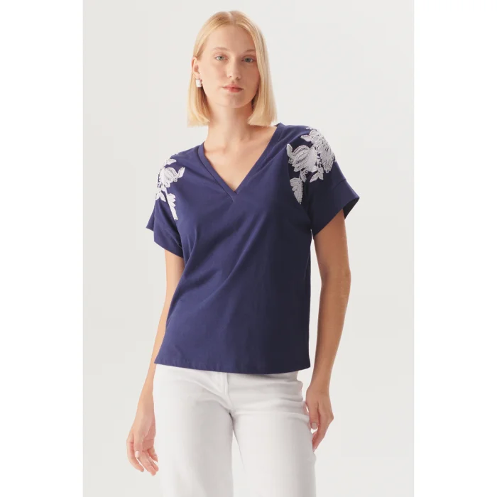 Şıklığı ve rahatlığı bir arada sunan bu V yaka lacivert pamuklu t-shirt, zarif işleme detayları ile dikkat çekiyor. Omuz kısmında yer alan çiçek motifli işlemeler, t-shirt’e sofistike bir hava katarken, regular fit kesimi sayesinde konforlu bir kullanım sunar. Günlük kombinlerinize zarif bir dokunuş katmak için ideal bir seçimdir.