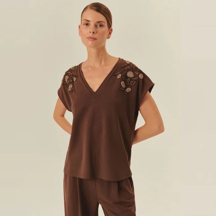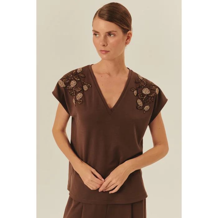 Bu şık ve zarif kahverengi t-shirt, omuz bölgesinde yer alan el işçiliği detaylarıyla dikkat çekiyor. V yaka kesimi ile feminen bir hava katarken, omuzlardaki işlemeler t-shirt'e lüks bir görünüm kazandırıyor. Günlük kombinlerden özel davetlere kadar geniş bir kullanım alanı sunan bu model, stilinize sofistike bir dokunuş ekler.