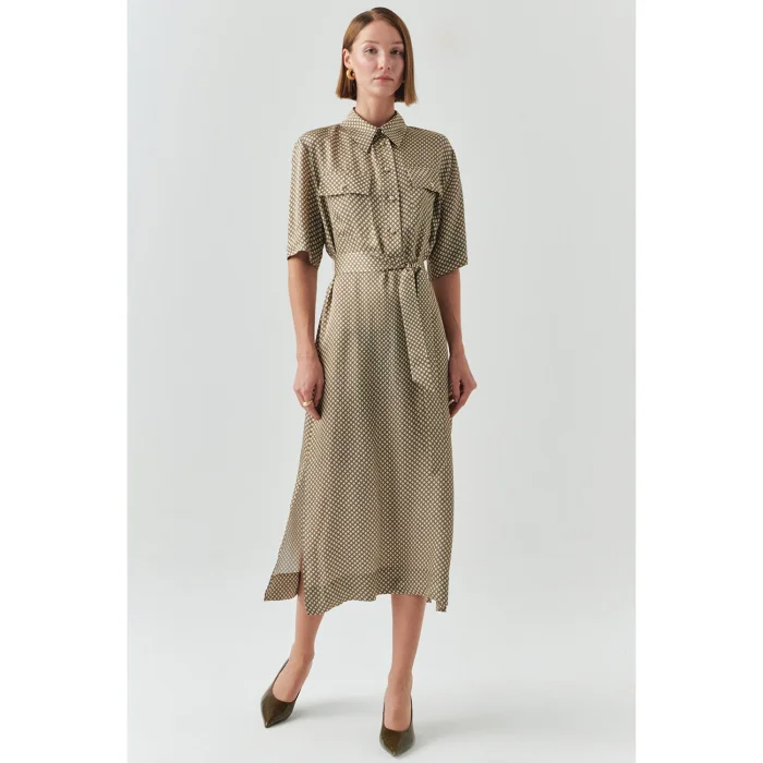 Küçük desenleriyle hareket kazanan bu midi elbise, gömlek yakası ve kısa kollarıyla hafif bir şıklık sunar.